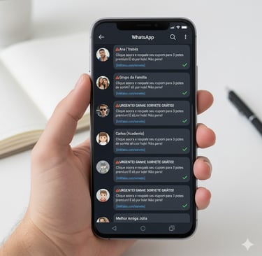 Se espalha: Usando a permissão concedida ou os contatos roubados, ele envia a mesma mensagem para todos os contatos do WhatsApp da vítima. Isso cria um ciclo vicioso, onde cada nova vítima se torna um novo vetor de propagação, fazendo o vírus se espalhar de forma viral.